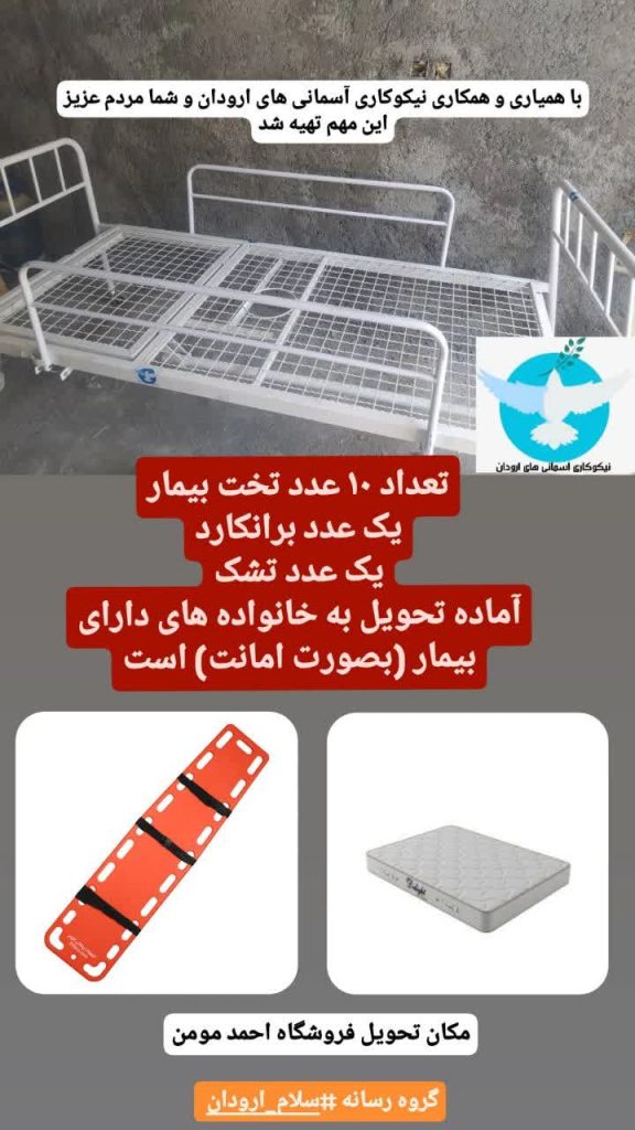 تعداد 10 عدد تخت بیمار، یک عدد برانکارد و یک تشک در مغازه آقای احمد عباسی(09171849132) آماده تحویل به خانواده های دارای بیمار به صورت امانی می باشد.